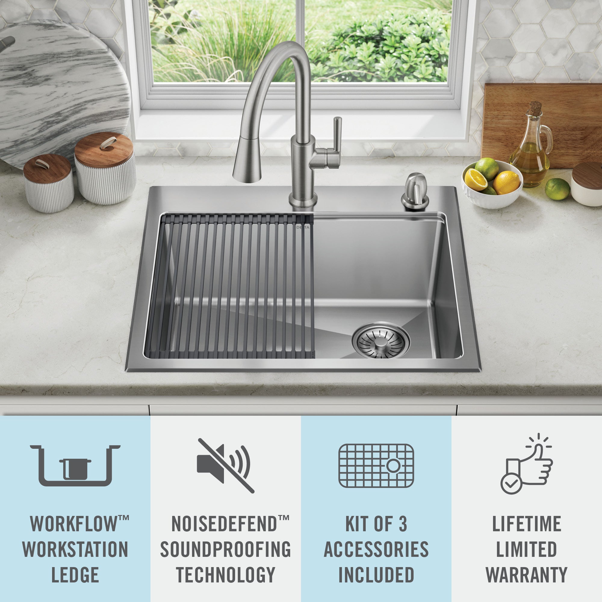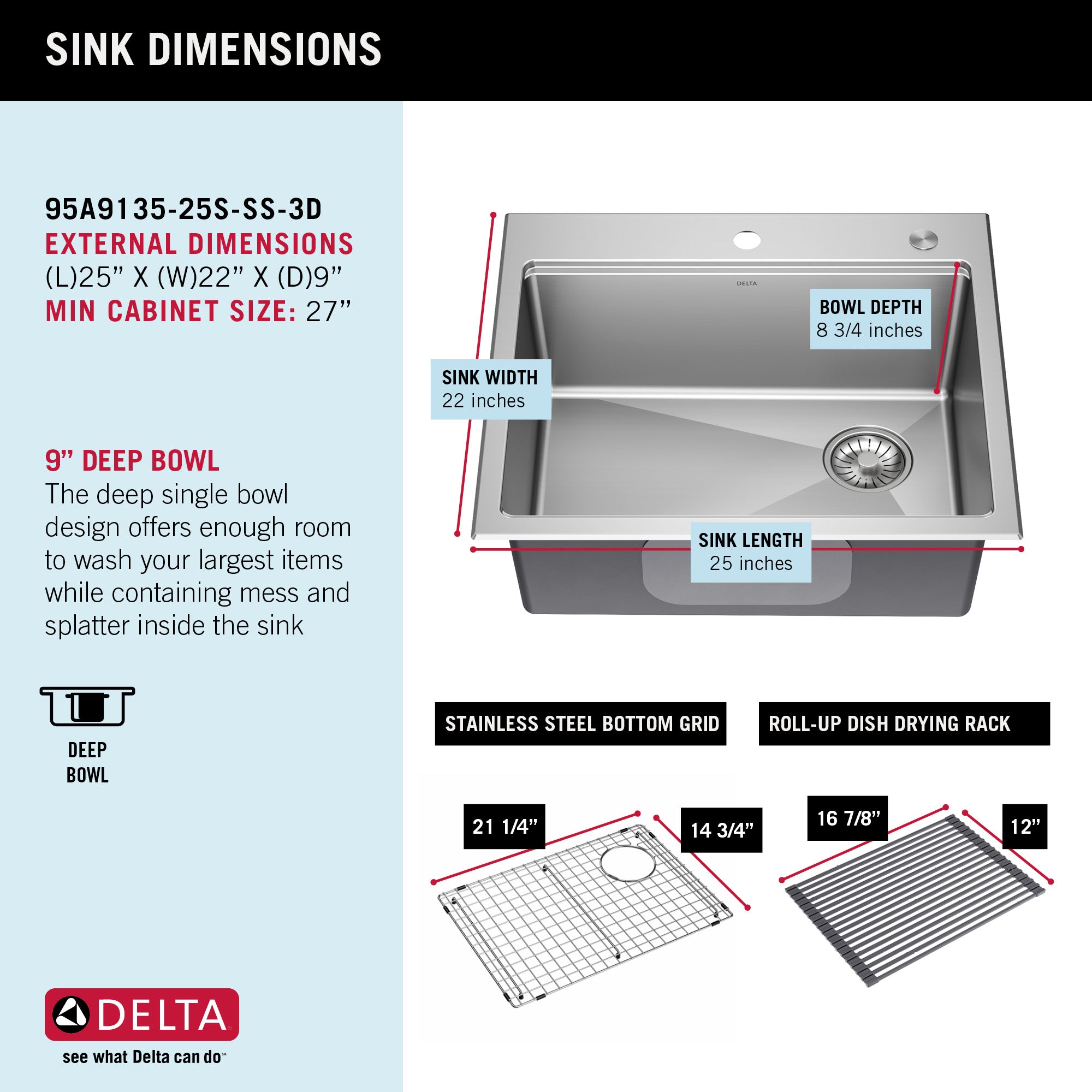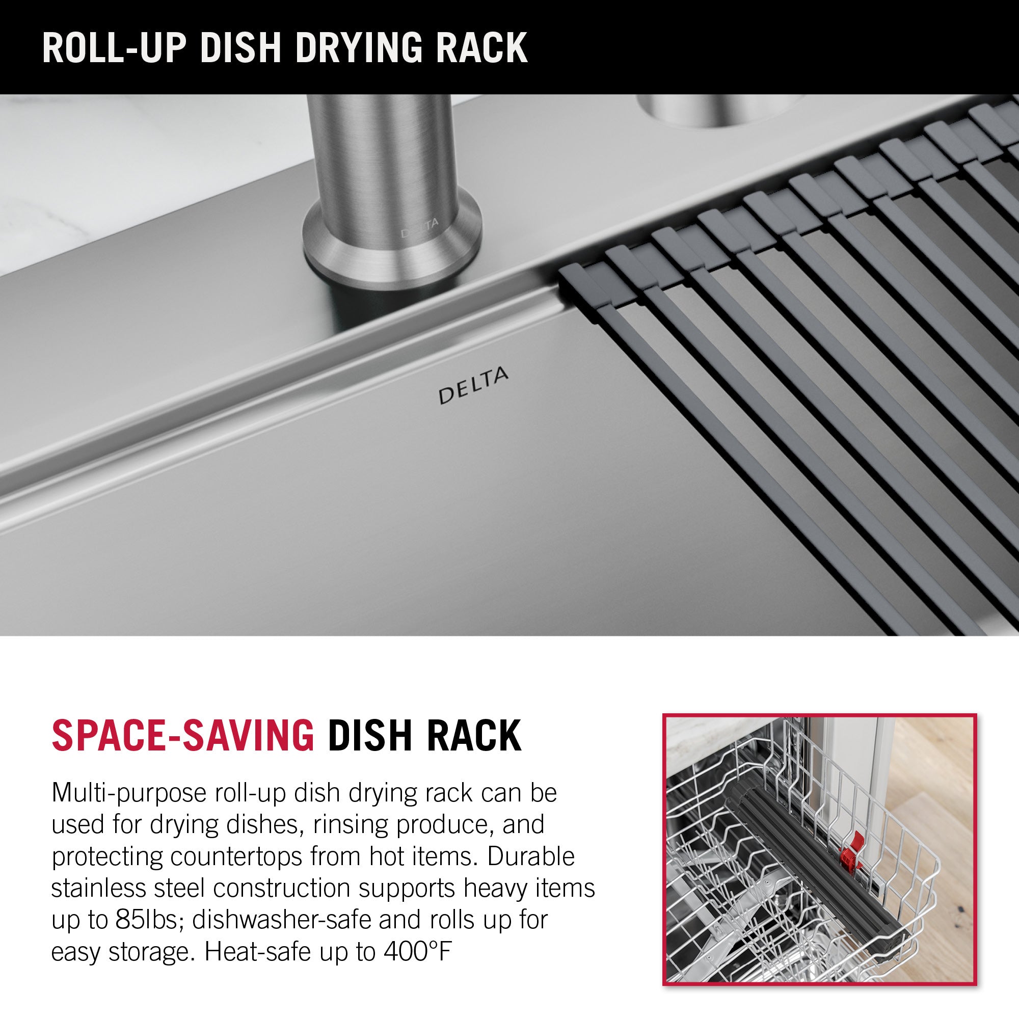 Modernize your kitchen workflow with Delta Workstation Sinks: From compact bar/prep sinks to high-capacity sinks that can handle a wide variety of kitchen tasks, the Emery Collection has the perfect option to suit your needs. Designed with your busy life in mind, these sinks feature a WorkFlow ledge with a variety of multifunctional accessories that create a versatile and eye-catching workspace. The included roll-up dish rack helps keep your kitchen counters dry and makes clean-up easy by allowing water to drain directly into the sink. Durable stainless steel construction supports heavy items, while the convenient roll-up design fits into drawers or cabinets for easy storage. Designed to look great in any kitchen, Emery sinks boast sleek lines and rounded corners with a universal transitional aesthetic. Ideal for DIY projects and retrofitting into an existing countertop cutout, the dual-mount design installs as an undermount or drop-in with any type of kitchen counter material. The beveled mounting deck creates a finished look, with 2 pre-drilled holes for kitchen faucet and accessory installation. Constructed with heavy-duty 18-gauge stainless steel and easy-to-clean SatinSheen finish, these sinks offer lasting durability and easy maintenance. The deep single bowl with sloped bottom and channel grooves fits plenty of dishes and helps ensure easy drainage while containing mess and splatter inside the sink. NoiseDefend soundproofing reduces noise and vibration to help keep your kitchen quiet and peaceful. Each sink comes with mounting hardware, bottom grid, and drain assembly so you can tackle your home improvement project with ease. Backed by a Lifetime Limited Warranty so that you can choose Delta products with confidence