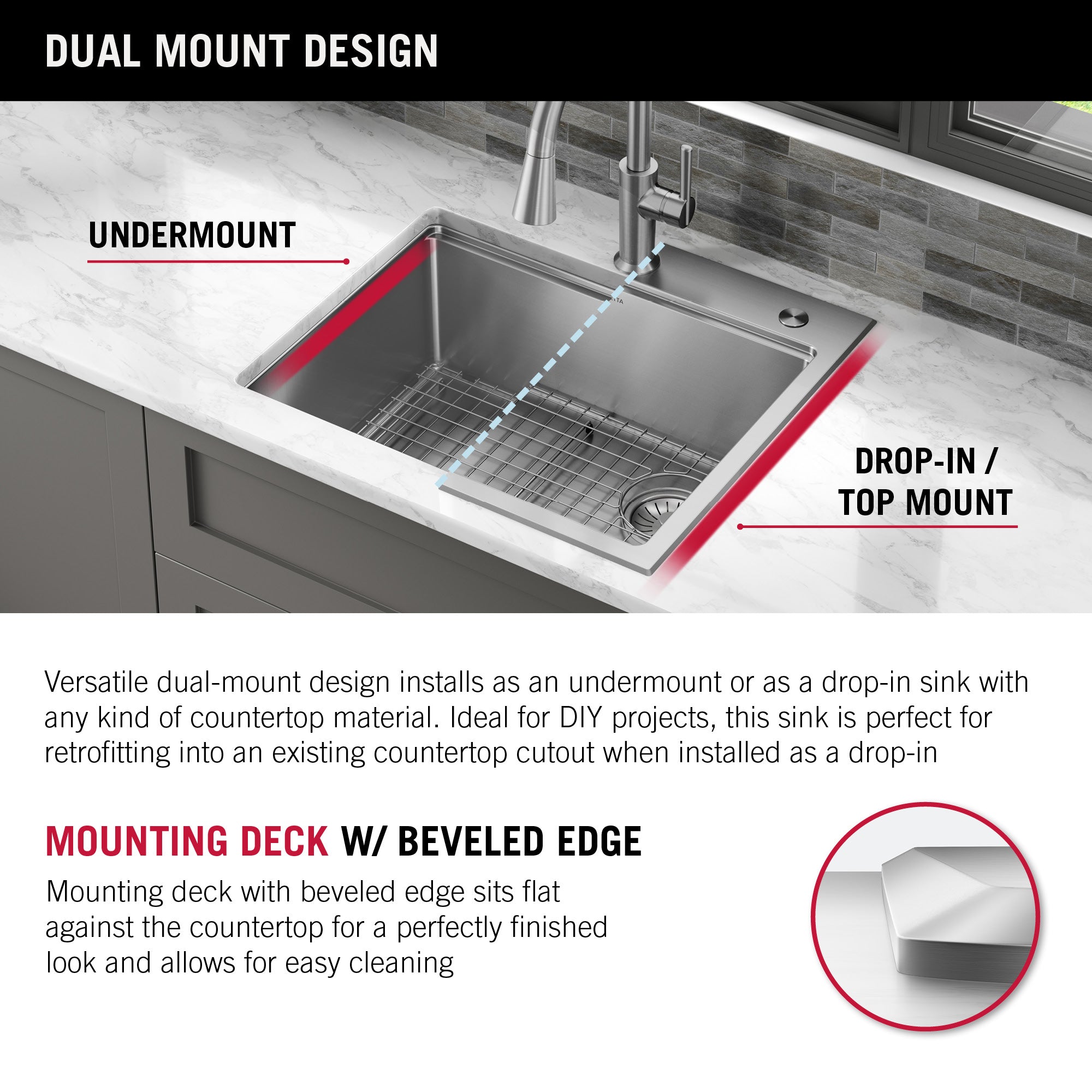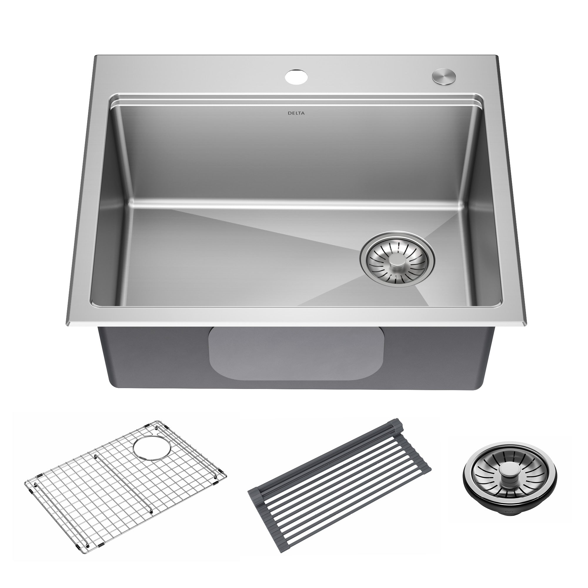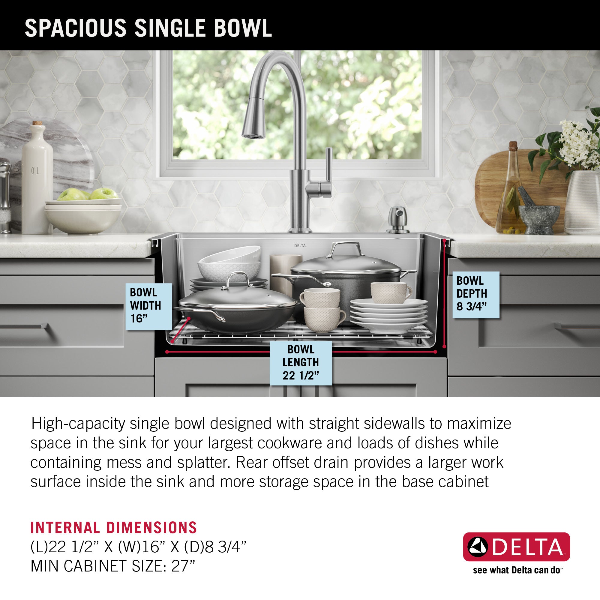 Modernize your kitchen workflow with Delta Workstation Sinks: From compact bar/prep sinks to high-capacity sinks that can handle a wide variety of kitchen tasks, the Emery Collection has the perfect option to suit your needs. Designed with your busy life in mind, these sinks feature a WorkFlow ledge with a variety of multifunctional accessories that create a versatile and eye-catching workspace. The included roll-up dish rack helps keep your kitchen counters dry and makes clean-up easy by allowing water to drain directly into the sink. Durable stainless steel construction supports heavy items, while the convenient roll-up design fits into drawers or cabinets for easy storage. Designed to look great in any kitchen, Emery sinks boast sleek lines and rounded corners with a universal transitional aesthetic. Ideal for DIY projects and retrofitting into an existing countertop cutout, the dual-mount design installs as an undermount or drop-in with any type of kitchen counter material. The beveled mounting deck creates a finished look, with 2 pre-drilled holes for kitchen faucet and accessory installation. Constructed with heavy-duty 18-gauge stainless steel and easy-to-clean SatinSheen finish, these sinks offer lasting durability and easy maintenance. The deep single bowl with sloped bottom and channel grooves fits plenty of dishes and helps ensure easy drainage while containing mess and splatter inside the sink. NoiseDefend soundproofing reduces noise and vibration to help keep your kitchen quiet and peaceful. Each sink comes with mounting hardware, bottom grid, and drain assembly so you can tackle your home improvement project with ease. Backed by a Lifetime Limited Warranty so that you can choose Delta products with confidence