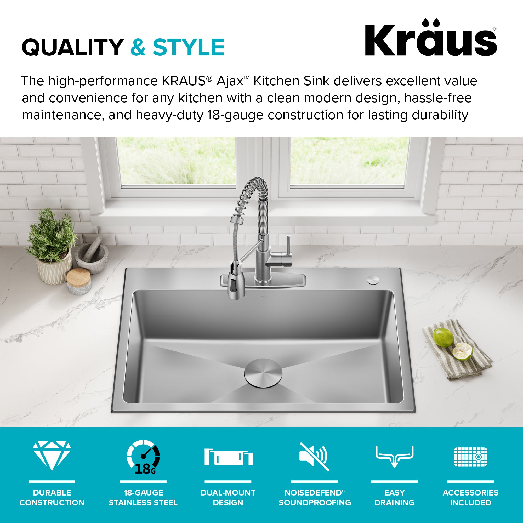 Featuring a large single bowl with clean modern design and hassle-free maintenance, the KRAUS Ajax Kitchen Sink delivers excellent value and convenience for any kitchen. Heavy-duty 18-gauge T-304 stainless steel helps prevent dents and damage, offering lasting durability with great resistance to corrosion and rust. Installation is easy with a dual-mount design that allows you to install as an undermount sink or as a drop-in sink with any kind of countertop material. The thick mounting deck sits flat against the countertop for a finished look, with a beveled edge for easy cleaning and 2 pre-drilled holes for installation of kitchen faucet and accessory. Large NoiseDefend sound dampening pads help absorb noise and vibration from dishes and glassware. Designed with wear-resistant finish and rounded corners, this sink is easy to keep clean with minimal maintenance. Channel grooves and a sloped bottom help prevent water from pooling for easy draining. This single bowl sink comes with a protective bottom grid, drain assembly with decorative cover, cut-out templates, and mounting hardware for drop-in and undermount installation