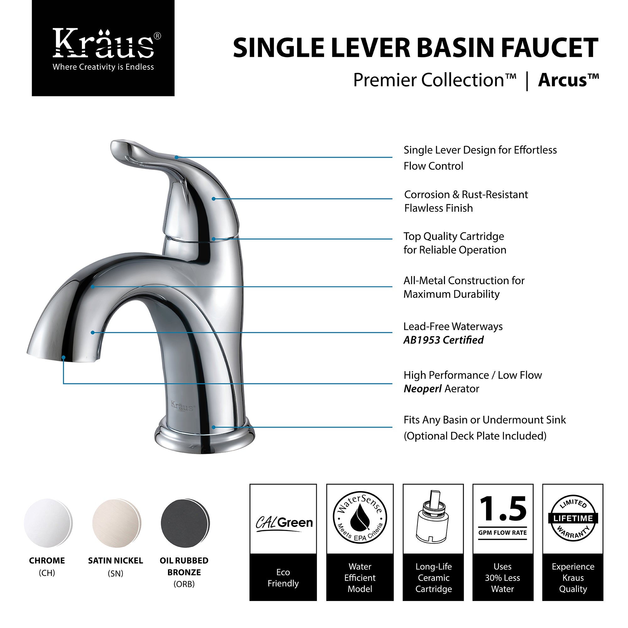 Kraus bathroom faucets combine substance with style, for a dramatic look with contemporary appeal. With designs ranging from transitional to modern, the options are endless for all your stylish bathroom ideas. Each basin faucet is created using top-quality components, including a ceramic cartridge for reliable drip-free use and a best-in-industry aerator to reduce water waste without compromising pressure. Designed to complement your basin or undermount sink, the sleek Arcus faucet coordinates with a variety of decor styles. Choose from a range of distinctive finishes to create a bathroom you love.