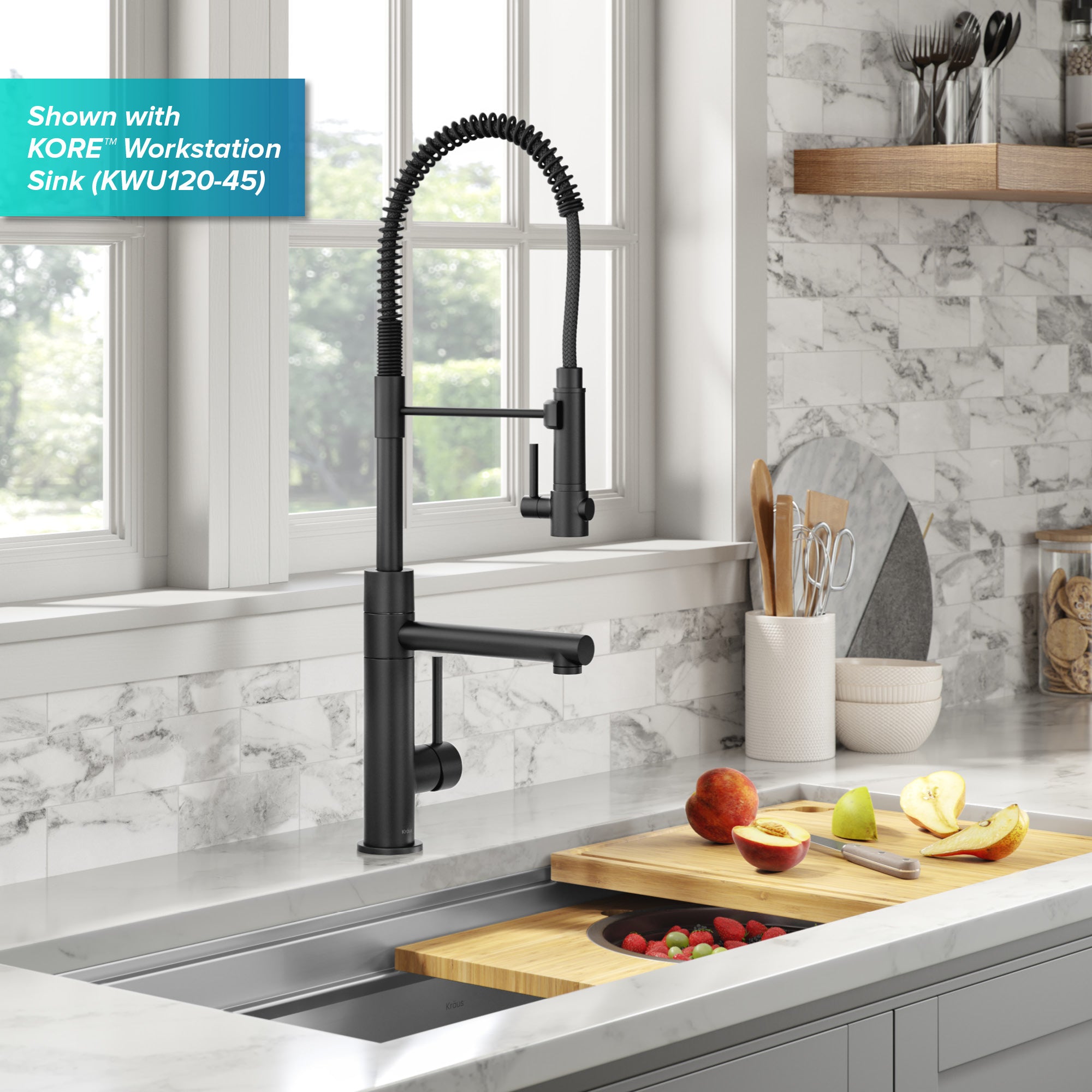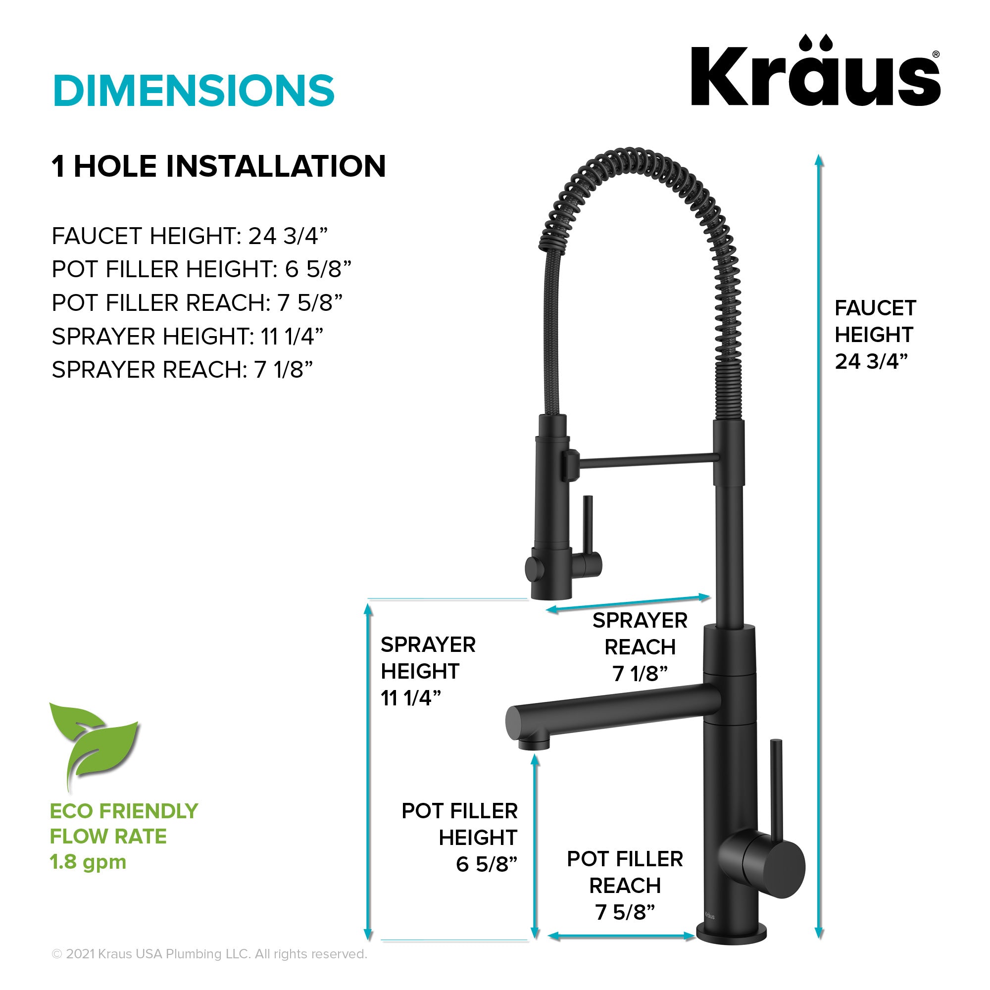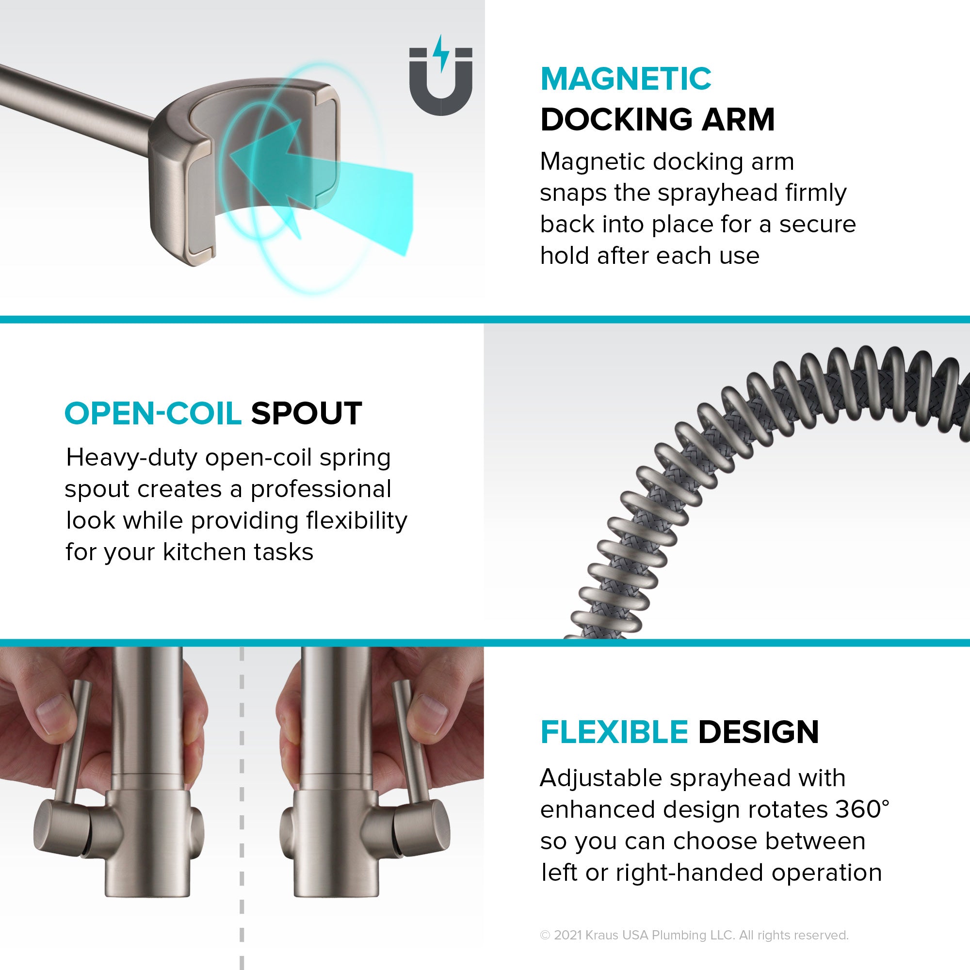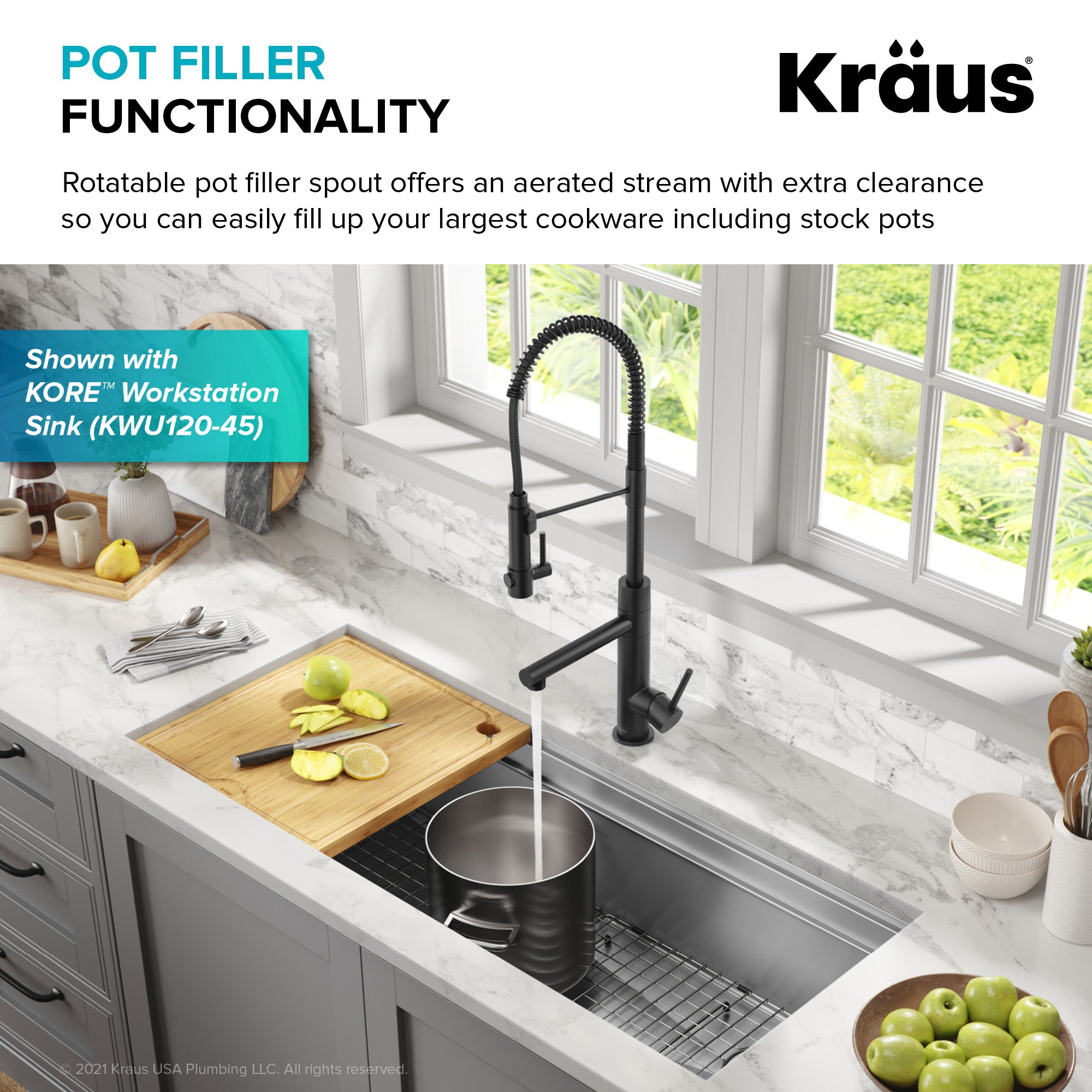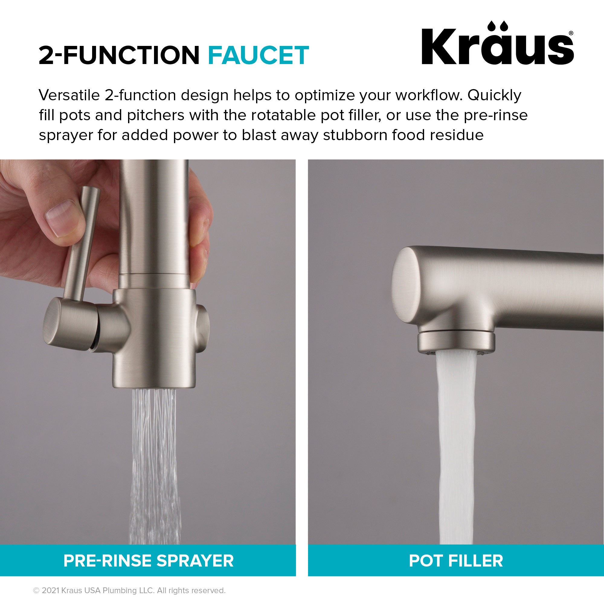 Upgrade your kitchen style with the professional look of the KRAUS Artec Pro kitchen faucet, featuring a dual-tap design with an open-coil spring spout and rotating pot filler for enhanced functionality. The pot filler spout creates a soft aerated stream for quickly filling large pots and pitchers, while the pre-rinse sprayer provides added power for blasting away stubborn food residue. Designed for a full range of motion, the sprayer and pot filler spout rotate independently, allowing you to position the faucet exactly how you need it for any kitchen task. Magnetic docking snaps the sprayhead back into place for a secure hold after each use. The high-arc design offers ample space for washing oversized items in the kitchen sink. Soft rubber nozzles on the sprayer allow you to easily wipe away mineral build-up, helping ensure long-lasting performance. The ergonomic single lever handle is designed with 90° forward rotation for installation flexibility in spaces with limited backsplash clearance. The robust design features lead-free all-metal construction and premium components, including a ceramic cartridge to help ensure lasting leak-free use. Available in a variety of striking corrosion-resistant finishes, including Spot Free Finish options that help resist water spots and fingerprints for easy maintenance. Comes with pre-attached water lines and mounting hardware for easy DIY installation during your home improvement project