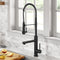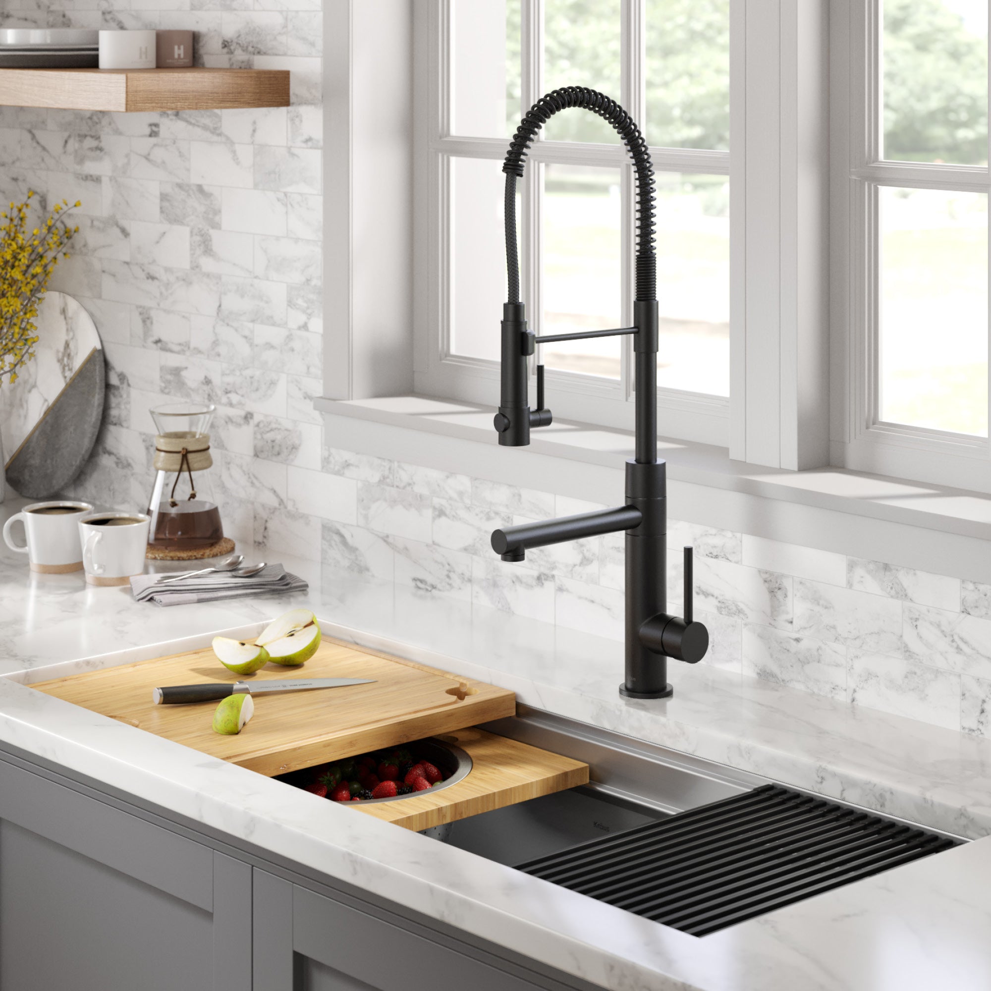 - COMMERCIAL-STYLE FAUCET with pre-rinse sprayer creates a distinctive professional look with an industrial open-coil spout and rotating pot-filler