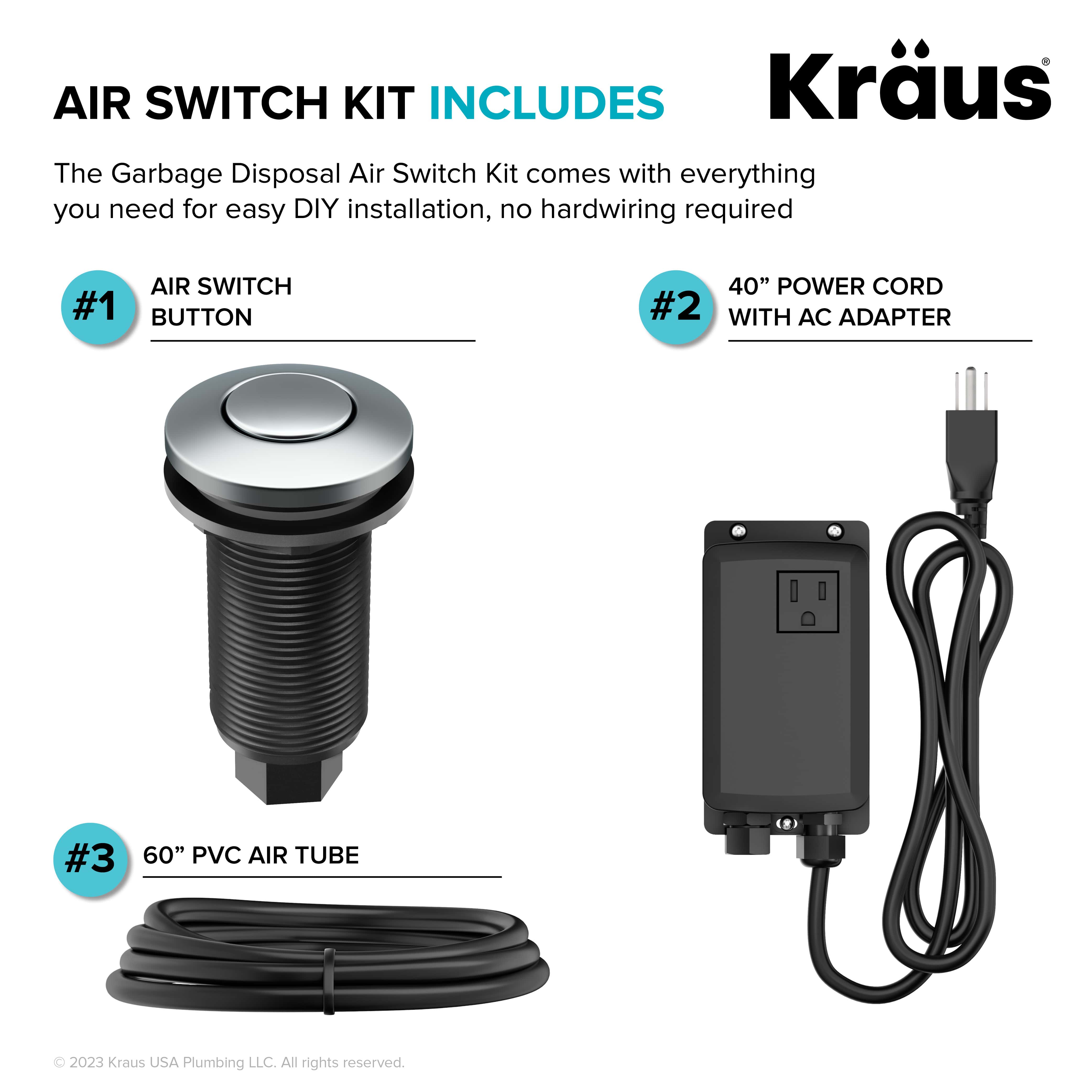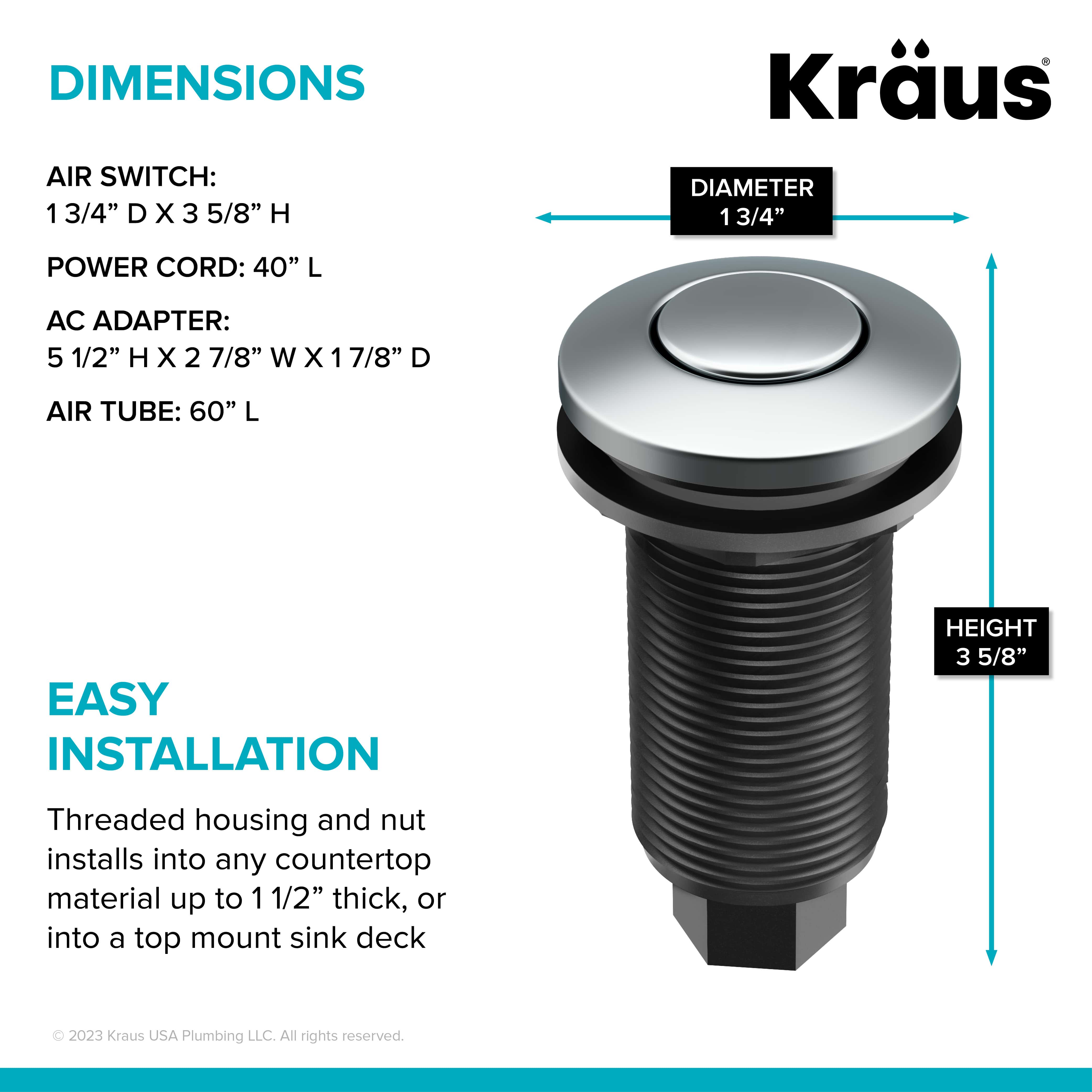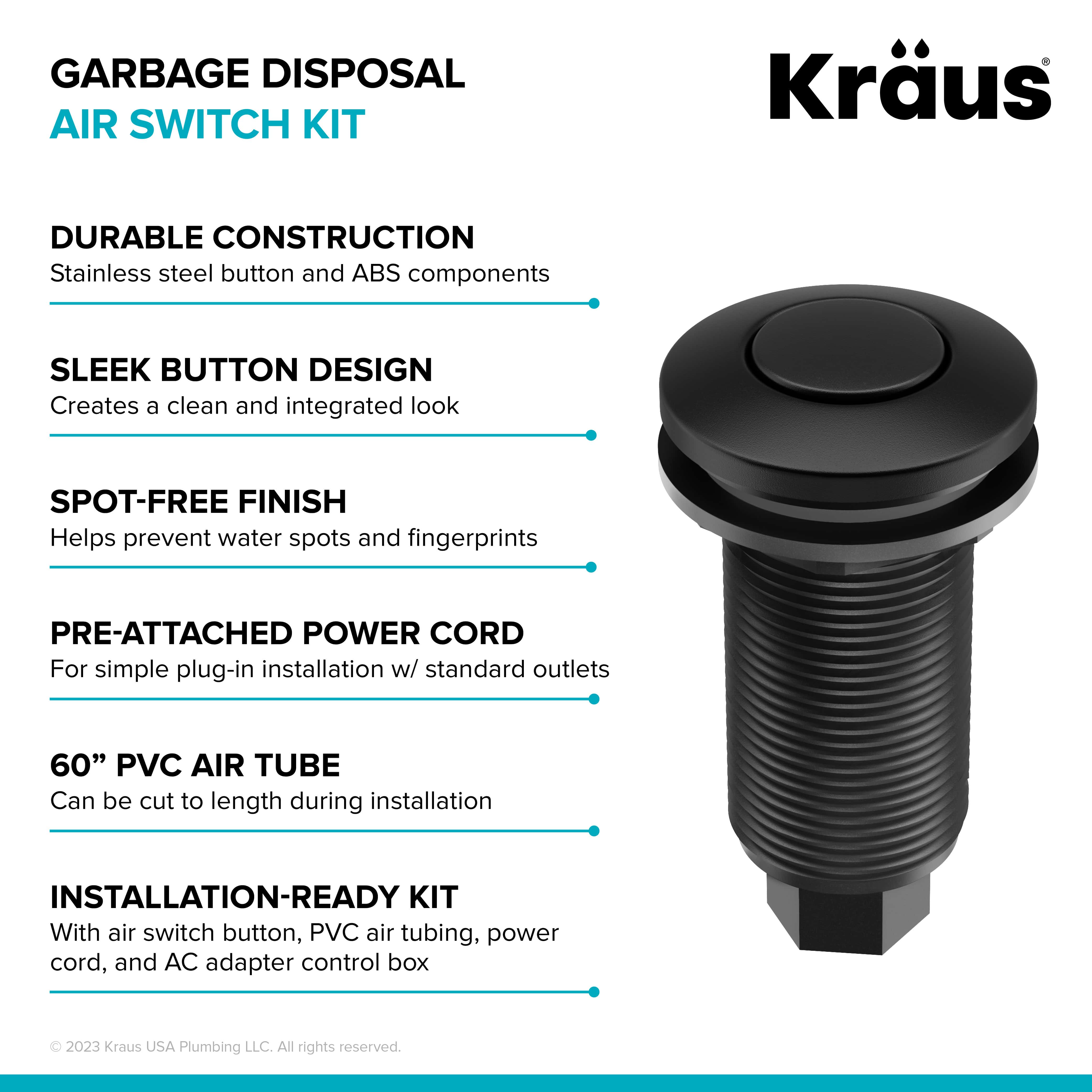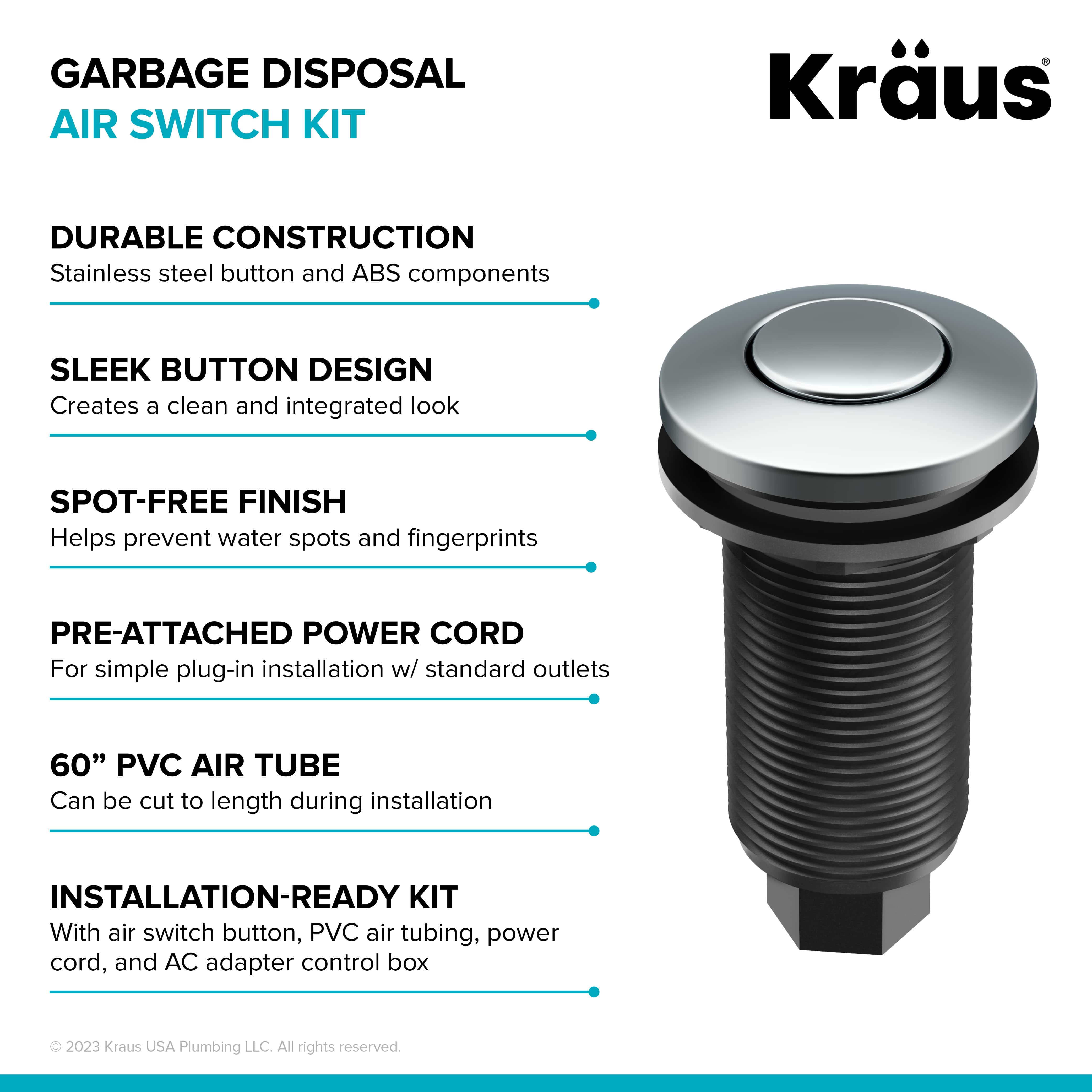 The KRAUS Garbage Disposal Air Switch Kit offers a sleek and functional alternative to traditional wall-mount toggle switches, allowing you to activate your garbage disposal with the push of a button while creating a coordinated look with your kitchen faucet. The air switch mounts to your countertop or sink deck, simplifying installation and making it easy to use your disposal. By eliminating the need for a dedicated wall switch, this device helps ensure that there is no live electricity at countertop level, offering a worry-free alternative to an electrical switch that helps prevent the risk of shock if operated with wet and soapy hands. The threaded housing can be installed into countertops up to 1 1/2” thick, or into a top mount sink deck with standard 1 1/4” soap dispenser accessory hole. Durable stainless steel construction and ABS components help ensure long-lasting operation. The universal design can be used with most disposals on the market, including the KRAUS WasteGuard Garbage Disposal (model # KWD100-75MBL). The air switch is ideal for use on a kitchen island, where it is not possible to place a traditional wall outlet to power a garbage disposal. The streamlined button creates a clean and integrated look, and comes in a range of wear-resistant finish options to match your kitchen faucet, including Spot-Free Stainless Steel finish that resists water spots and fingerprints. Kit includes air switch button, PVC air tubing, power cord, and AC adapter for easy DIY installation