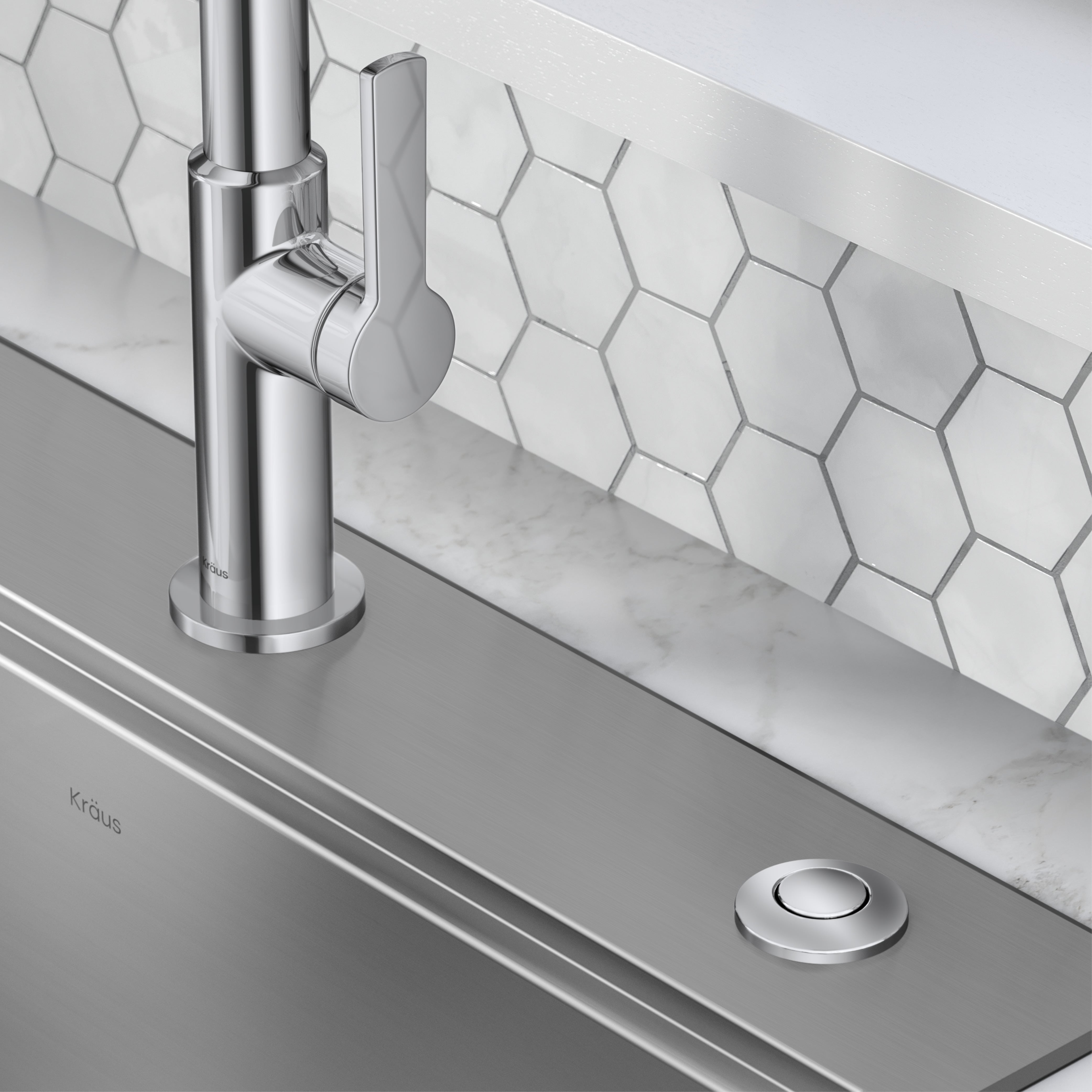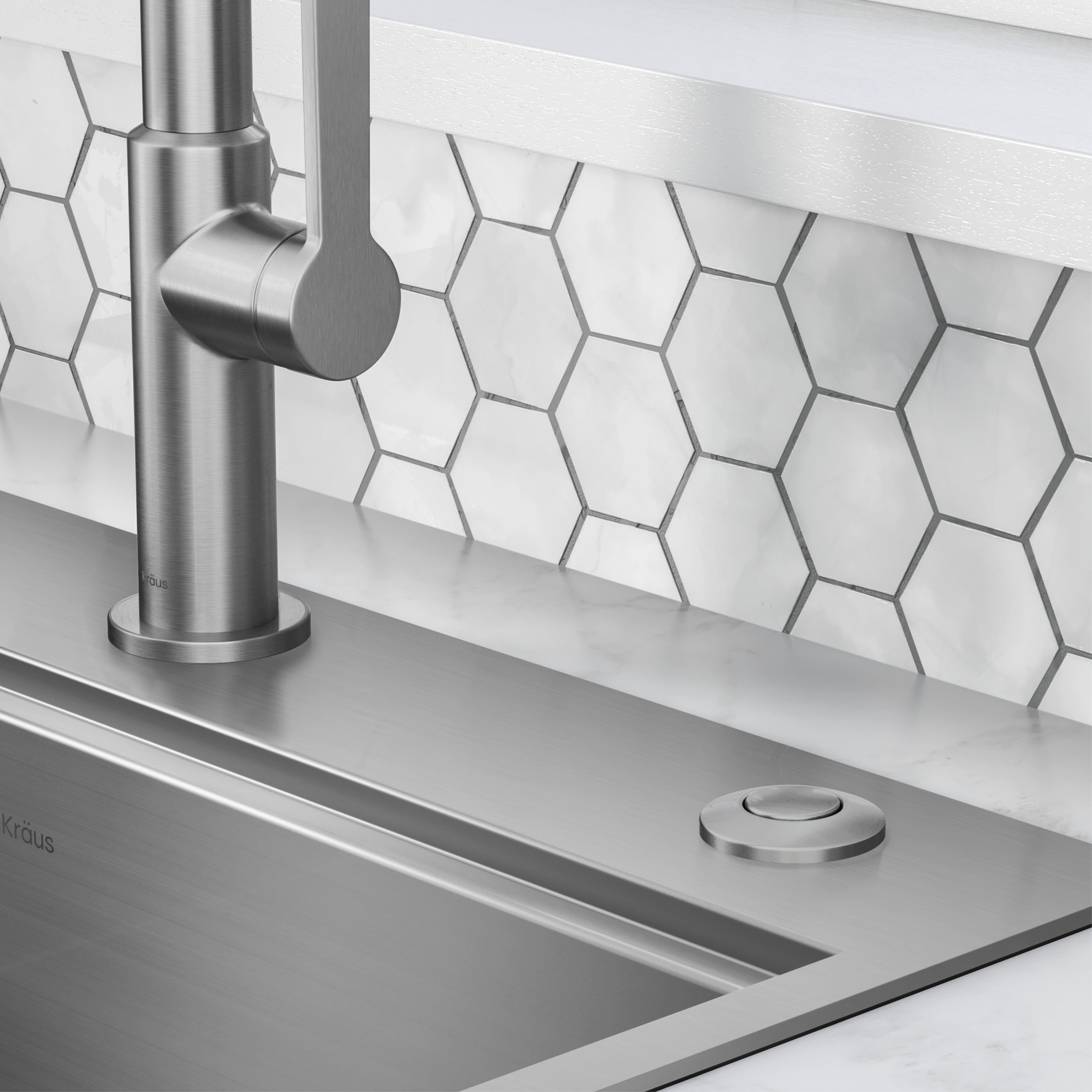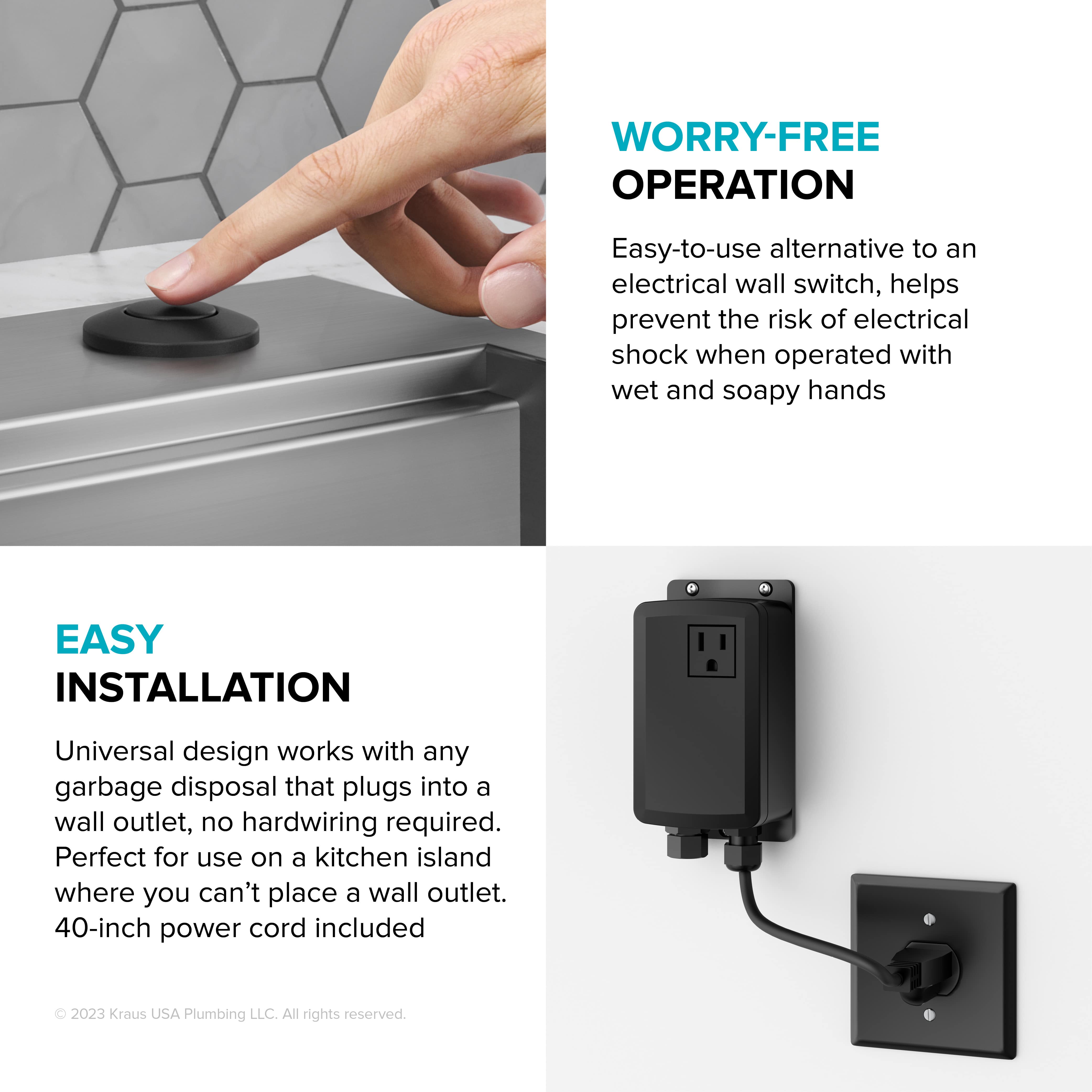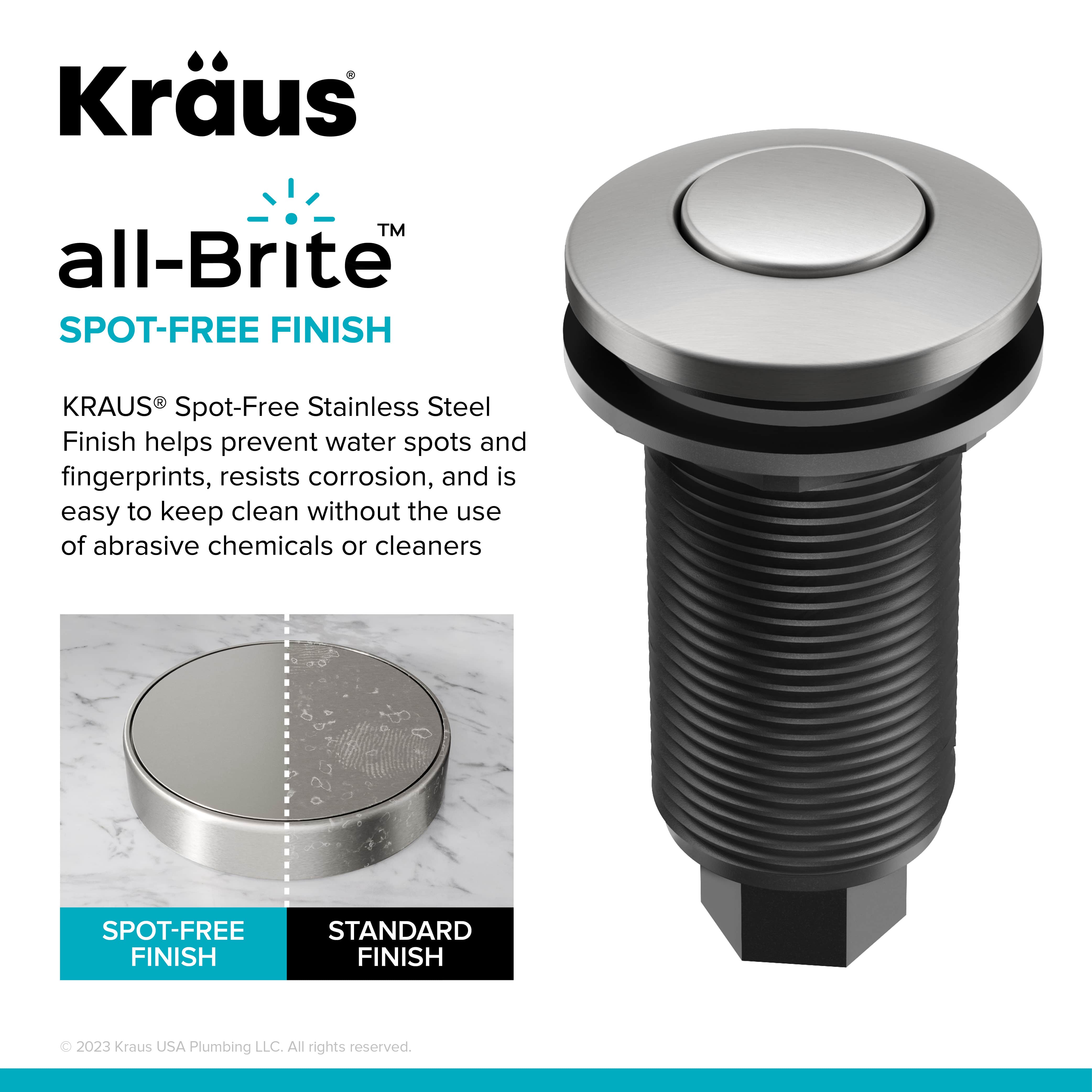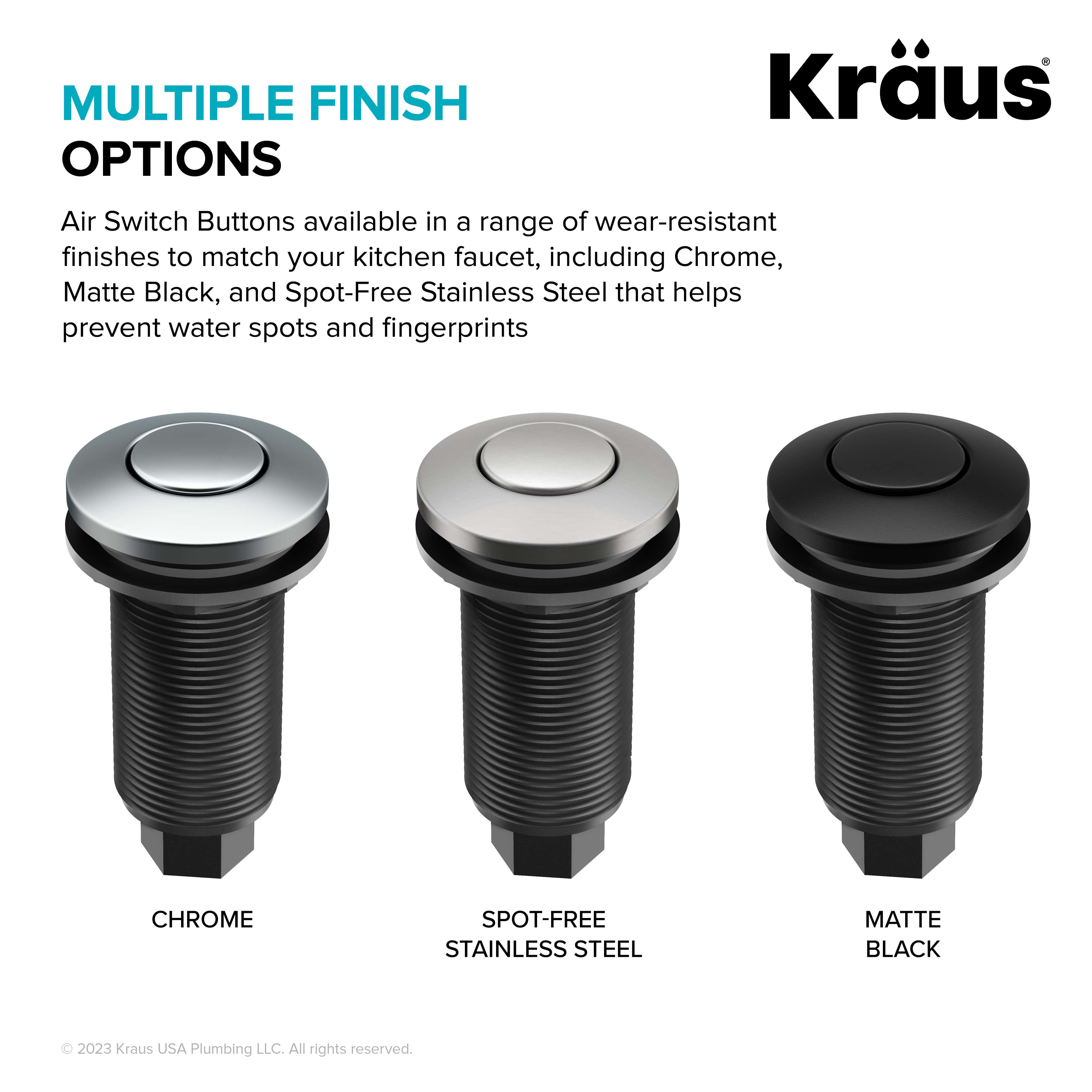 The KRAUS Garbage Disposal Air Switch Kit offers a sleek and functional alternative to traditional wall-mount toggle switches, allowing you to activate your garbage disposal with the push of a button while creating a coordinated look with your kitchen faucet. The air switch mounts to your countertop or sink deck, simplifying installation and making it easy to use your disposal. By eliminating the need for a dedicated wall switch, this device helps ensure that there is no live electricity at countertop level, offering a worry-free alternative to an electrical switch that helps prevent the risk of shock if operated with wet and soapy hands. The threaded housing can be installed into countertops up to 1 1/2” thick, or into a top mount sink deck with standard 1 1/4” soap dispenser accessory hole. Durable stainless steel construction and ABS components help ensure long-lasting operation. The universal design can be used with most disposals on the market, including the KRAUS WasteGuard Garbage Disposal (model # KWD100-75MBL). The air switch is ideal for use on a kitchen island, where it is not possible to place a traditional wall outlet to power a garbage disposal. The streamlined button creates a clean and integrated look, and comes in a range of wear-resistant finish options to match your kitchen faucet, including Spot-Free Stainless Steel finish that resists water spots and fingerprints. Kit includes air switch button, PVC air tubing, power cord, and AC adapter for easy DIY installation
