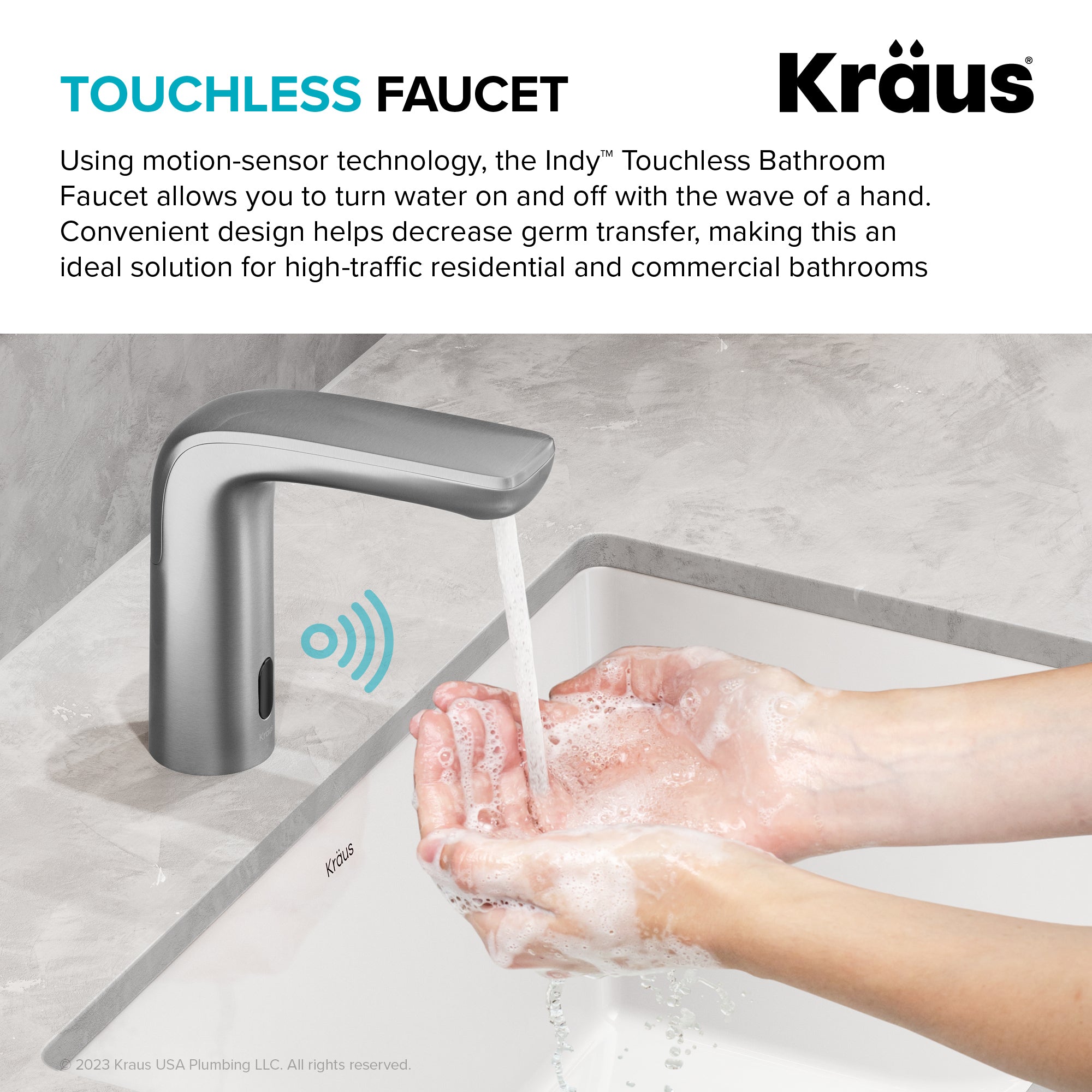 Defined by simplicity, the Indy Touchless Sensor Faucet features a streamlined spout with hidden control box that offers a clean modern aesthetic as well as easy and intuitive operation. Using motion-sensor technology to detect the presence of hands, this faucet allows you to turn water on and off with the wave of a hand. The convenient design helps decrease germ transfer, making this an ideal solution for high-traffic residential and commercial bathrooms. Water turns off automatically after 1 minute or when hands are no longer detected, helping to cut down on water waste and save money on water bills. The battery-operated design is easy to install with no hardwiring required and ensures that the sensor function will work during power outages. The control box connects to the faucet with Quick Connect adapters that easily snap into place. Temperature can be pre-set during installation using an under-counter mixing valve, which could help to prevent the risk of injury from hot water. Heavy-duty construction with premium components helps ensure reliable performance. The water-saving coin slot aerator helps reduce water waste without sacrificing pressure and is easy to remove for hassle-free maintenance. The universal design is ADA compliant and easy to control with hands-free operation, making it convenient to use. Comes with batteries, pre-attached water lines, and mounting hardware