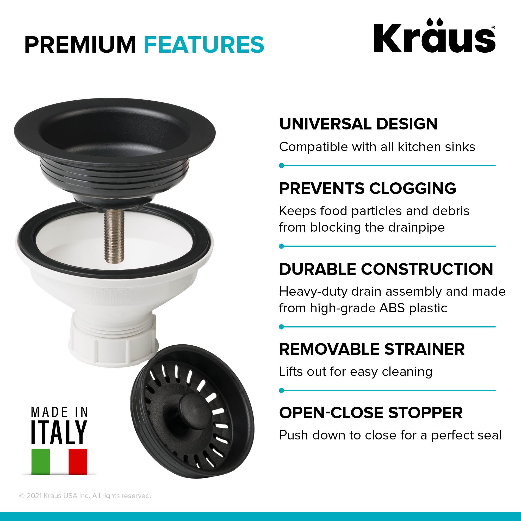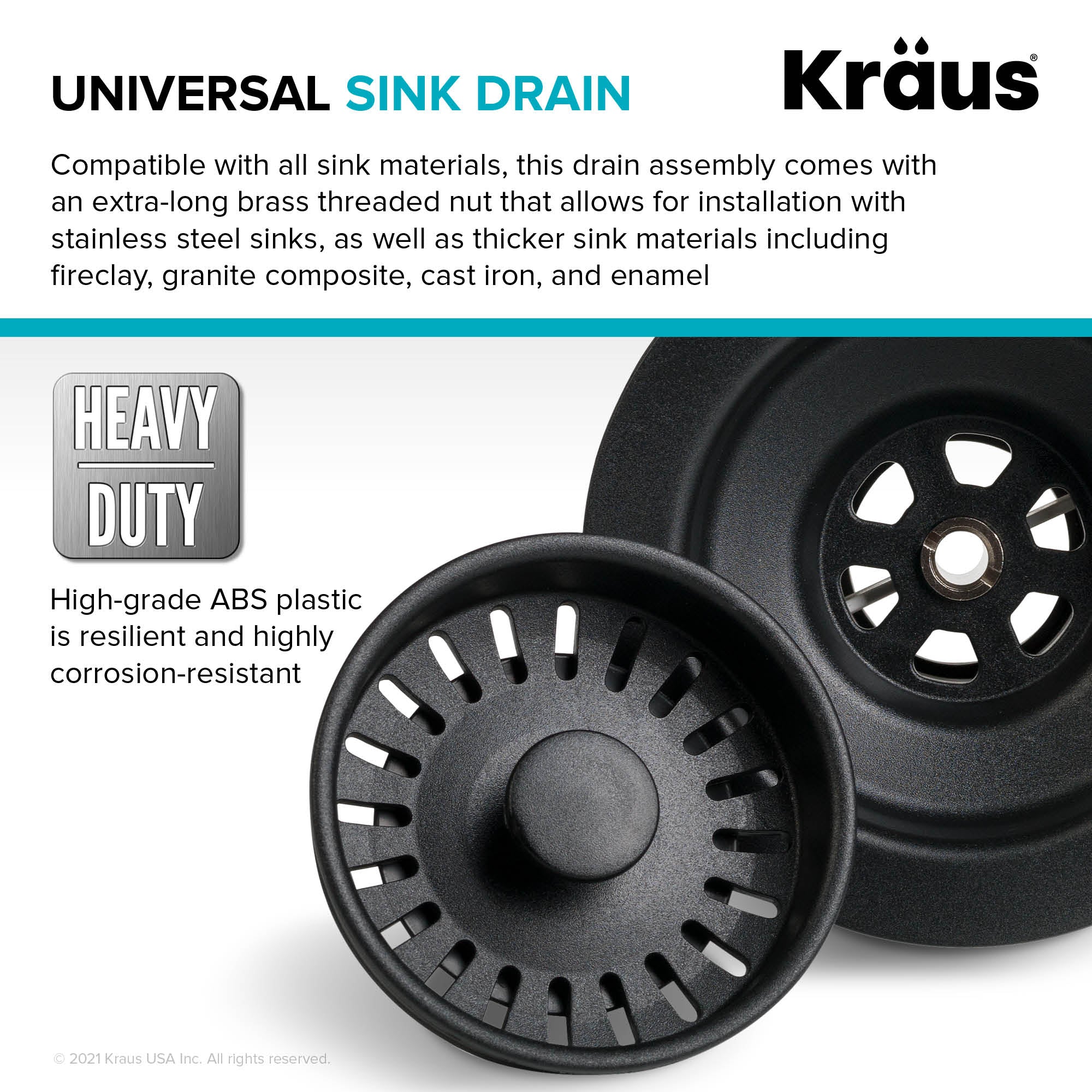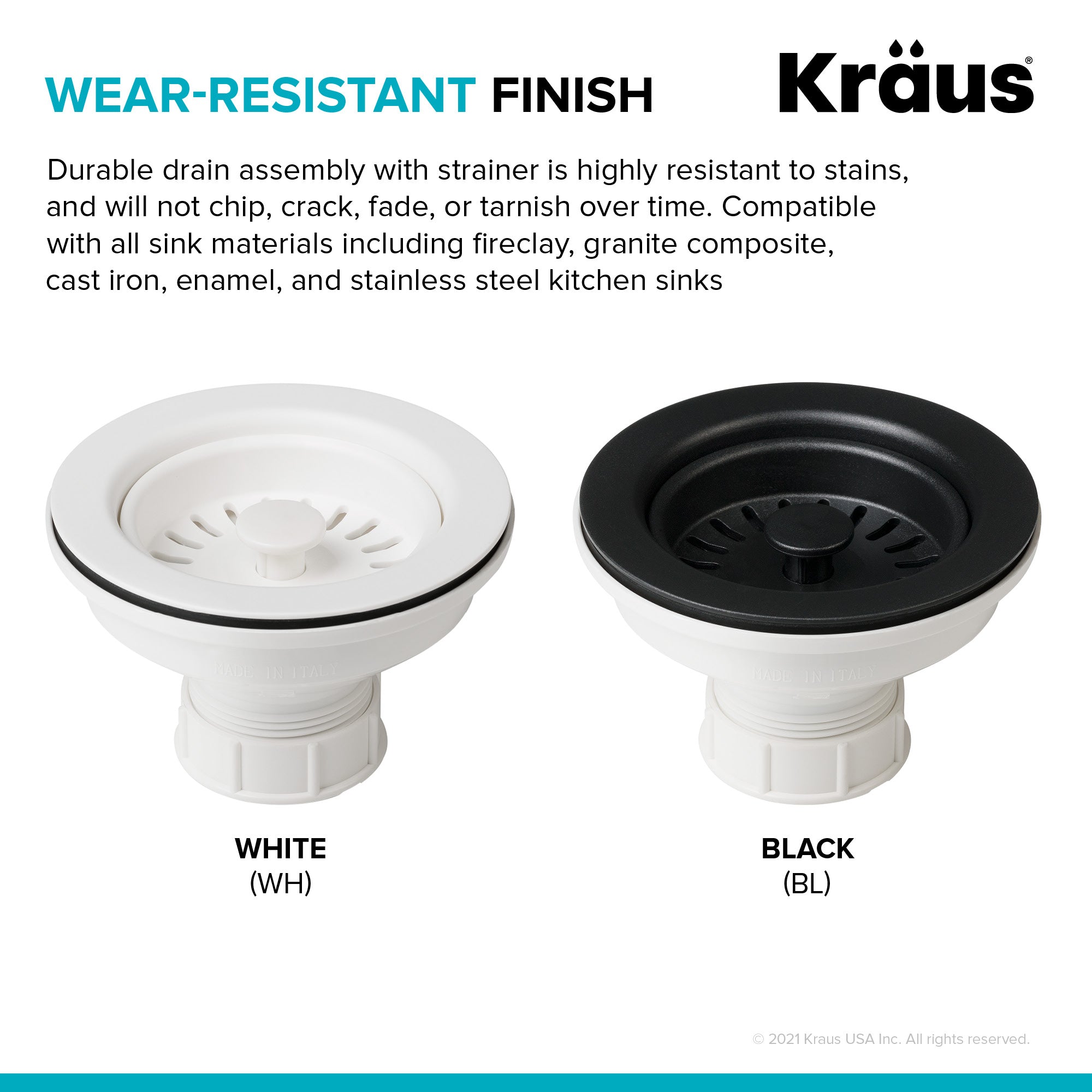 Kraus kitchen accessories provide everyday functionality with style. Constructed from durable corrosion-resistant ABS plastic for long-lasting performance, this heavy-duty kitchen sink drain assembly fits all sinks with a standard 3-1/2 or 4 in. drain opening. This essential accessory enhances the look and functionality of any sink, with quick and easy DIY installation that’s completely mess-free - no plumber’s putty required. The removable strainer traps food particles and debris to prevent your drainpipe from clogging, and lifts out for easy cleaning. An open/close stopper allows you to tightly seal the drain opening so that you can fill up the sink bowl for soaking dishes or deep cleaning. Available in Black or White with color that will not fade over time, this drain assembly is suitable for fireclay sinks, granite composite, enamel, cast iron, and even stainless steel kitchen sinks. The universal design is compatible with all standard size sink drains and garbage disposals. Kraus offers kitchen accessories in a variety of colors and styles; from protective bottom grids with commercial-grade durability, to cutting boards and multi-purpose roll-up dish drying racks that will enhance the way you use your workstation sink, to soap dispensers that match your kitchen faucet for that perfect final touch.