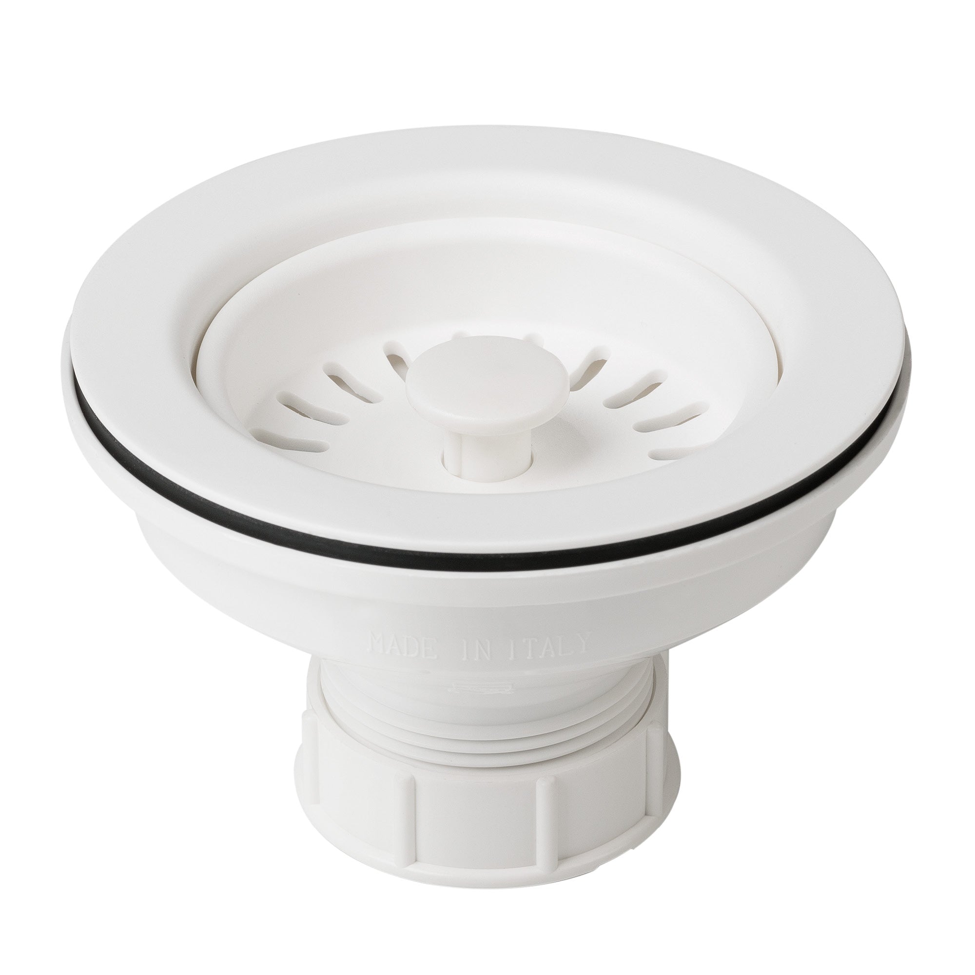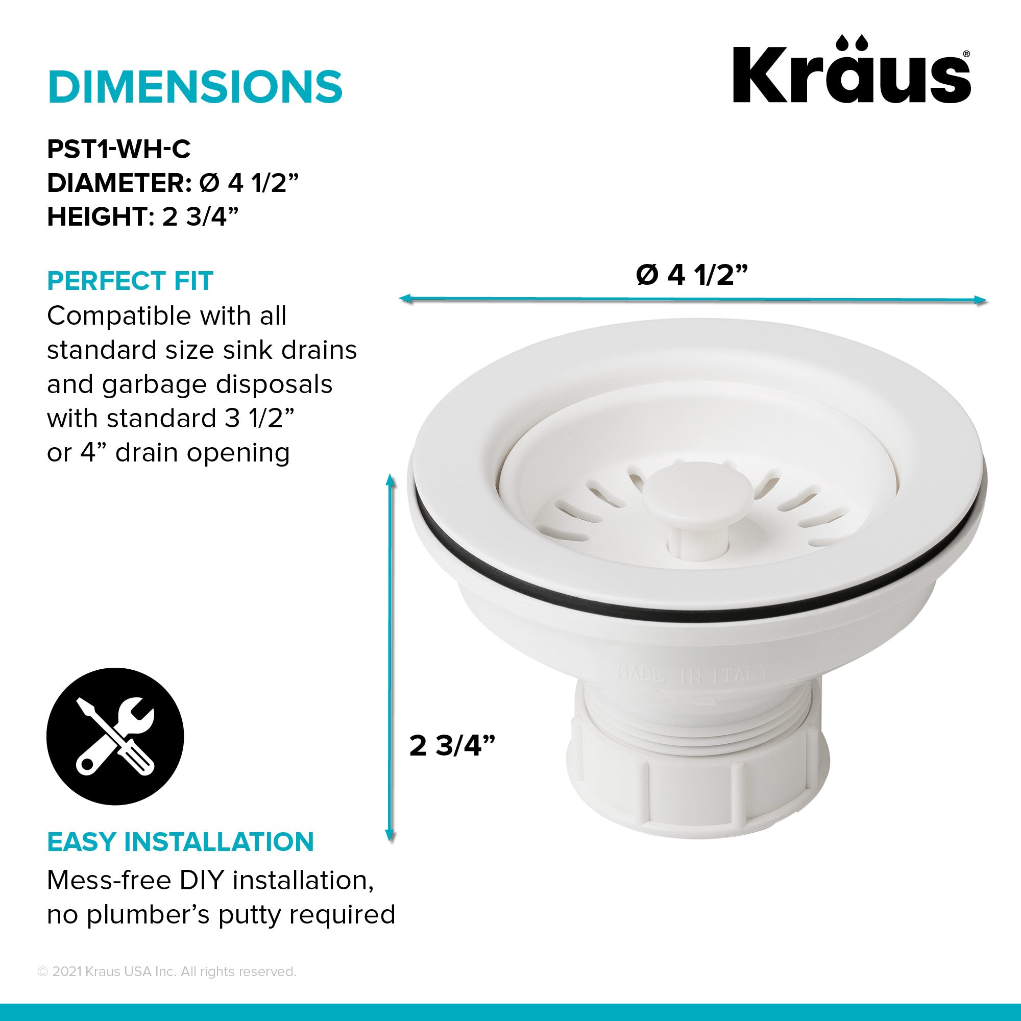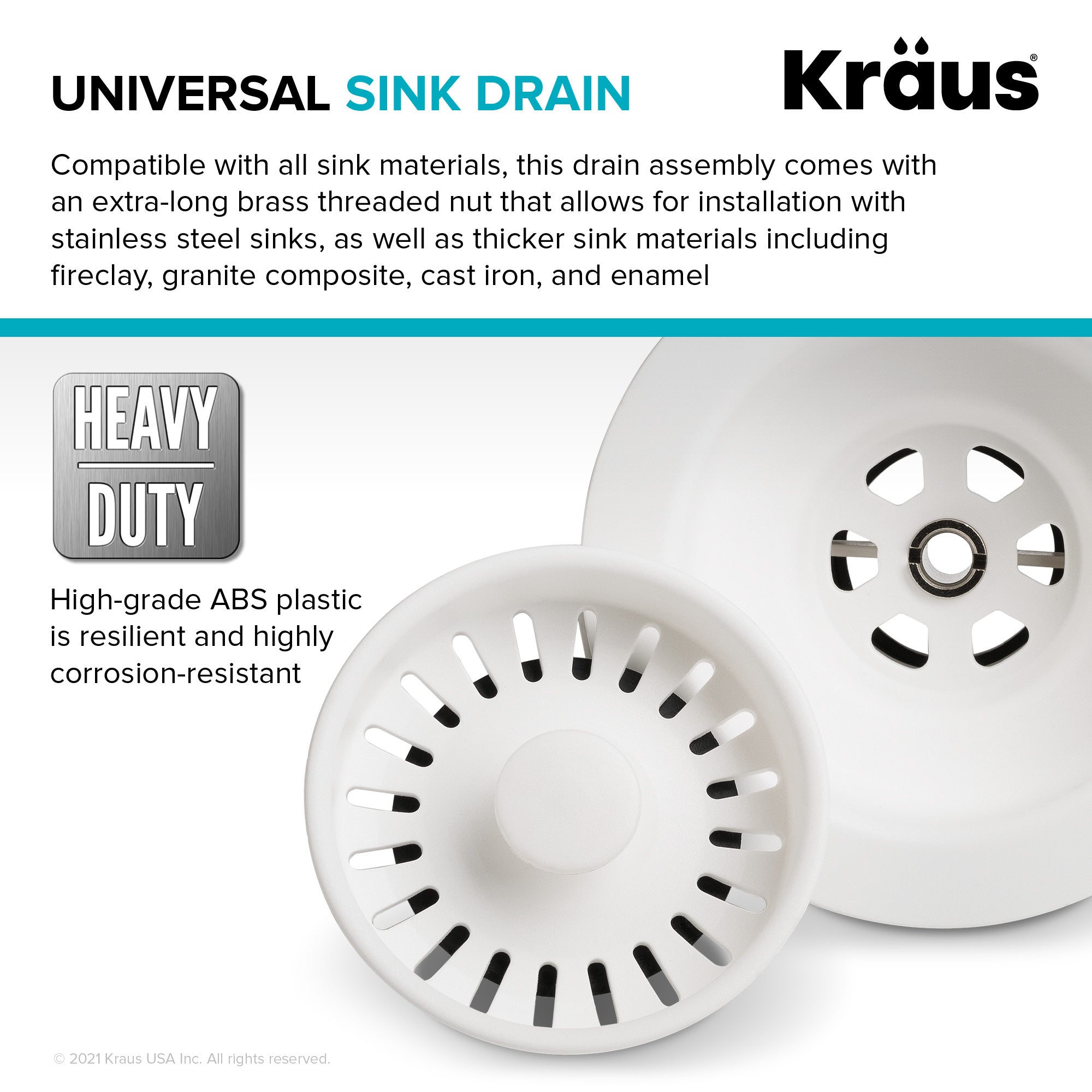 Kraus kitchen accessories provide everyday functionality with style. Constructed from durable corrosion-resistant ABS plastic for long-lasting performance, this heavy-duty kitchen sink drain assembly fits all sinks with a standard 3-1/2 or 4 in. drain opening. This essential accessory enhances the look and functionality of any sink, with quick and easy DIY installation that’s completely mess-free - no plumber’s putty required. The removable strainer traps food particles and debris to prevent your drainpipe from clogging, and lifts out for easy cleaning. An open/close stopper allows you to tightly seal the drain opening so that you can fill up the sink bowl for soaking dishes or deep cleaning. Available in Black or White with color that will not fade over time, this drain assembly is suitable for fireclay sinks, granite composite, enamel, cast iron, and even stainless steel kitchen sinks. The universal design is compatible with all standard size sink drains and garbage disposals. Kraus offers kitchen accessories in a variety of colors and styles; from protective bottom grids with commercial-grade durability, to cutting boards and multi-purpose roll-up dish drying racks that will enhance the way you use your workstation sink, to soap dispensers that match your kitchen faucet for that perfect final touch.