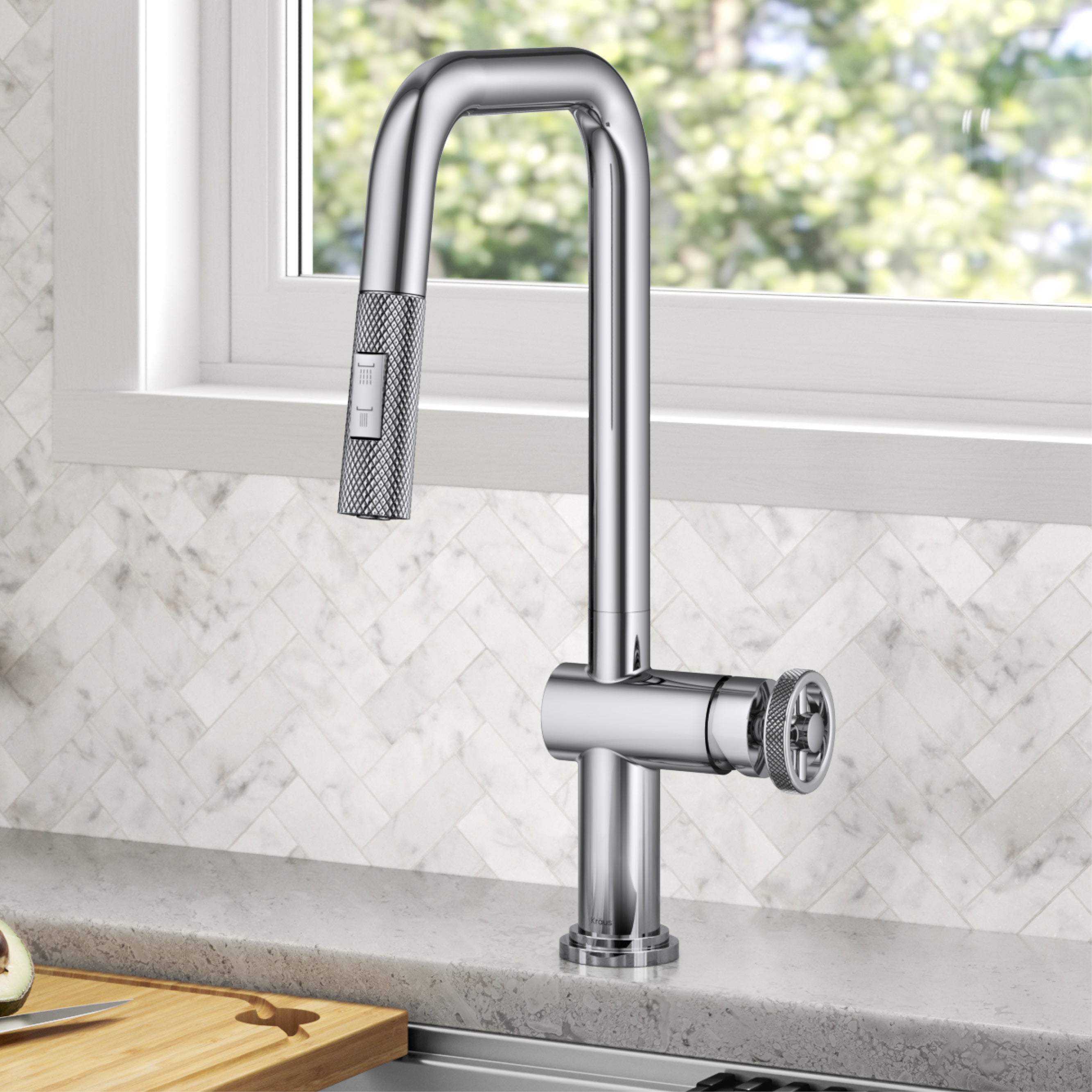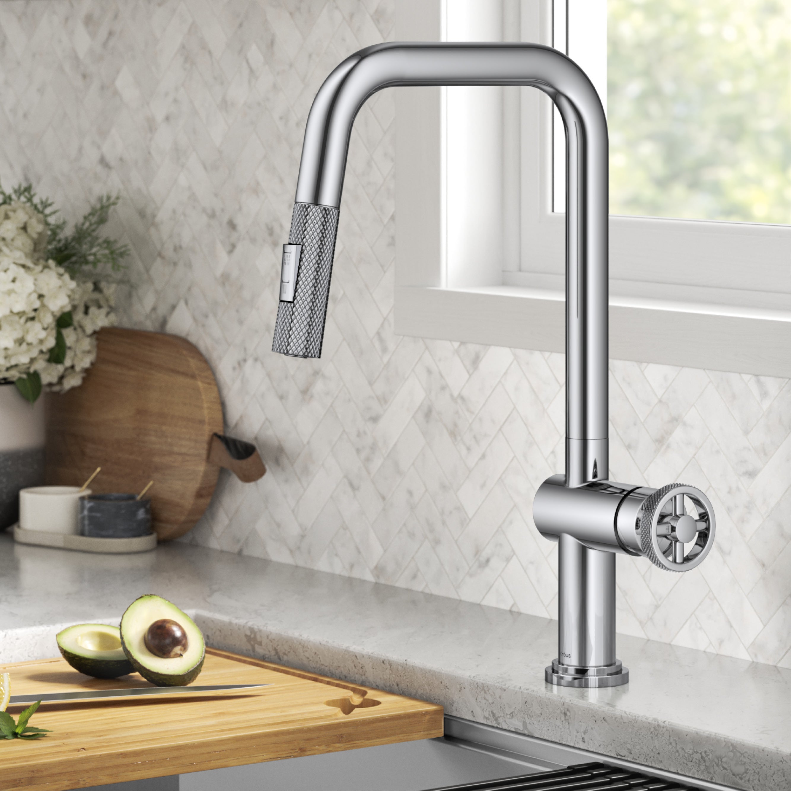 The Urbix Industrial Pull-Down Faucet brings rugged sophistication to any kitchen, with an angular silhouette that is enhanced by diamond-textured accents. Whether in a minimalist urban loft or in a modern farmhouse, the Urbix Kitchen Faucet defines any space with a bold industrial look. The wheel-shaped faucet handle allows for smooth control of water temperature and pressure, while diamond knurling provides a non-slip grip. With a striking square arc and generous spout height, the faucet offers ample space for oversized items like large pots and pitchers. A pull-down sprayhead with industrial knurling and Reach technology offers easy maneuverability and an extended range of motion so you can flex, pivot, and reach all around the kitchen sink. This faucet is designed with a two-function sprayhead to switch from aerated stream to powerful spray for rinsing dishes and washing away stubborn residue. Soft rubber nozzles on the sprayer allow you to wipe away mineral build-up, helping ensure lasting performance. The robust design features solid brass construction and premium components including a high-quality ceramic cartridge, snap-on counterweight, and quick connect sprayer hose that snaps together to help ensure leak-free use. Available in a variety of durable corrosion-resistant finishes, including Spot-Free Stainless Steel Finish that helps prevent water spots and fingerprints for easy maintenance. Comes with pre-attached water lines and mounting hardware